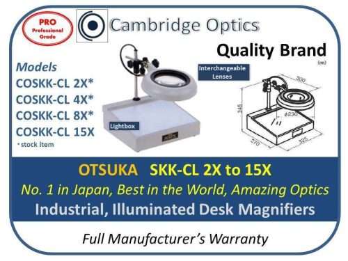2X-15X Dual Illuminated, Top Light and Lightbox, Desk Stand Magnifiers, Industrial Grade with Interchangeable Lenses. Otsuka Brand.