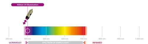 The AM4113FVT has special lighting with LED’s emitting UV light around the 395nm spectrum.
