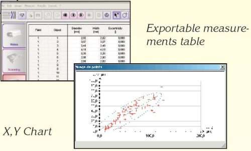 This software, if required, will orchestrate capture from a camera, movement by a motorised stage, automatic focussing by motorised focus, automatic calibration selection from a motorised microscope objective turret, automatic adjustment of image brightness, automatic background correction for uneven illumination, automatic feature detection, automatic feature separation and rapid analysis of dimensions and shapes and the immediate classification of the data into tables and graphs.