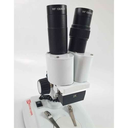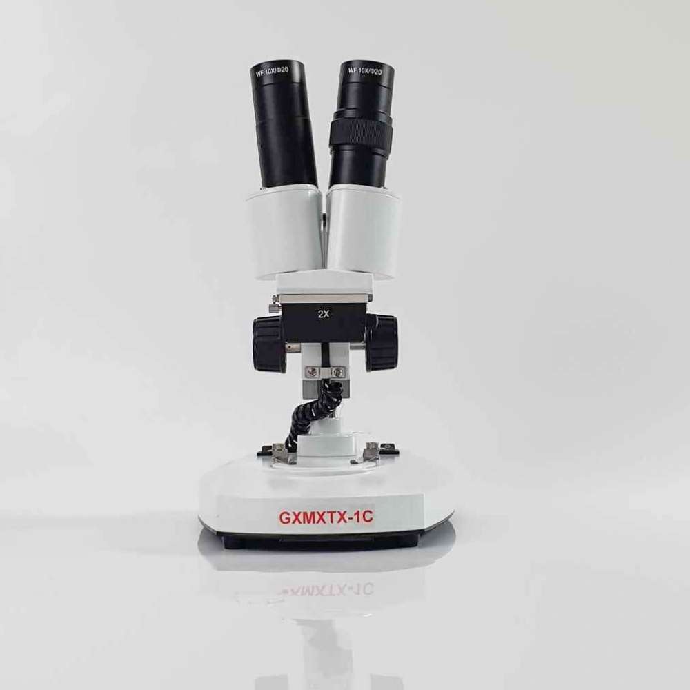 The XTX-1C fixed magnification stereo microscope by GX Microscopes features high quality glass optics with a pair of 10x eyepieces and 2x objective lens that provide a combined magnification of 20x. The sample is lit from above or below by built-in LED illumination, providing a heat-free light source.