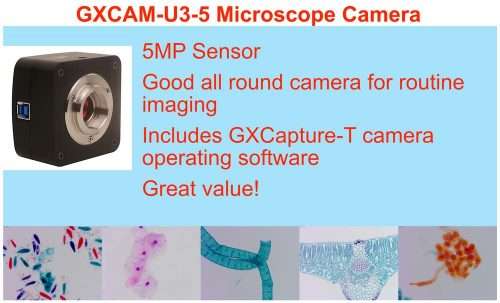 The GXCAM-U3-5 is part of our latest range of high performance, superb quality, USB-3 microscope cameras, featuring superfast refresh rates, amazing image quality, low noise, high sensitivity and excellent colour reproduction.ย Each camera incorprates the very latest camera sensor technology which delivers the very high quality images displayed using the free powerful GX Capture-T Software. ย These cameras attach to any c-mount camera adapter including eyepiece tube adapters.