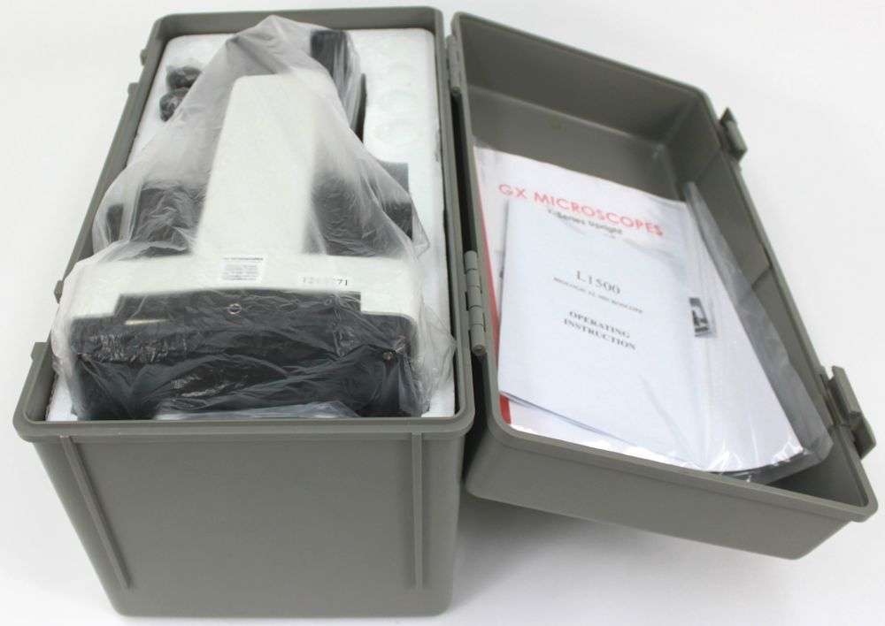 Grey Plastic Microscope Storage Case with Top Carry Handle. ย Polystyrene inserts are not included (these are provided with the microscope). ย Suitable for use with GXM JPL1350 series microscopes.