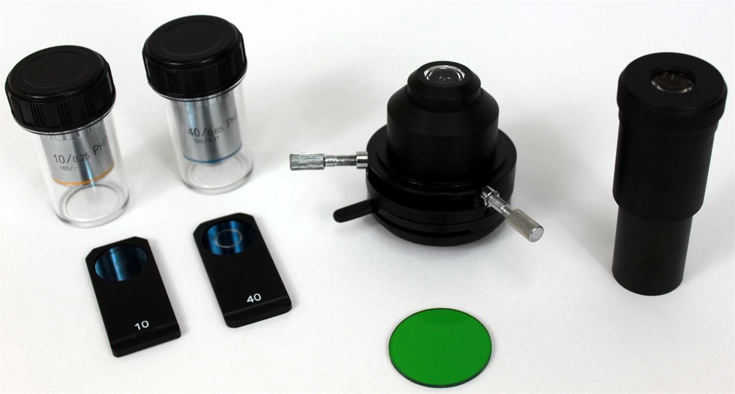 Slider Phase Kit comprising of: ย ย Infinity Slider Phase Kit comprising of: ย ย Slider Insert for 10X and 40X Objectives,ย Phase Condenser with Hole for Slider,ย 10X & 40X Plan Achromatic Phase Objectives,ย Suitable for infinity optics microscopes.ย ย The condenser of this kit replaces the standard condenser on your micoscope and the phase objectives should be used with the appropriate phase slider. ย Once the condenser is properly aligned using the centering telescope (mounted as a temporary eyepiece), this kit will provide you with a phase contrast image of your specimens.