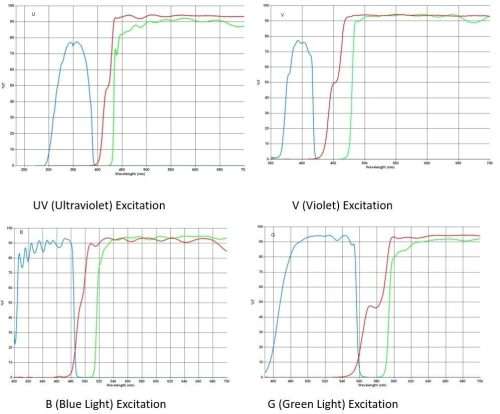 It is equipped with UV, violet, blue and green excitation fluorescence.