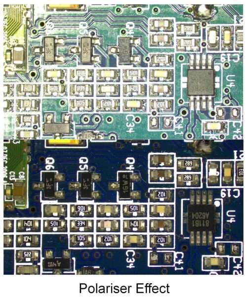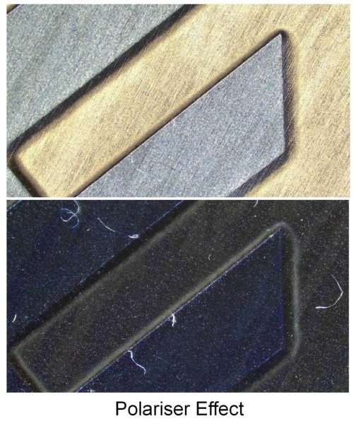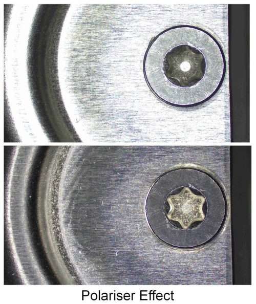 The rotatable polariser can help reduce reflections from shiny surfaces. This is an excellent illumination source for metallic samples, circuit boards, aquatic samples in dishes etc