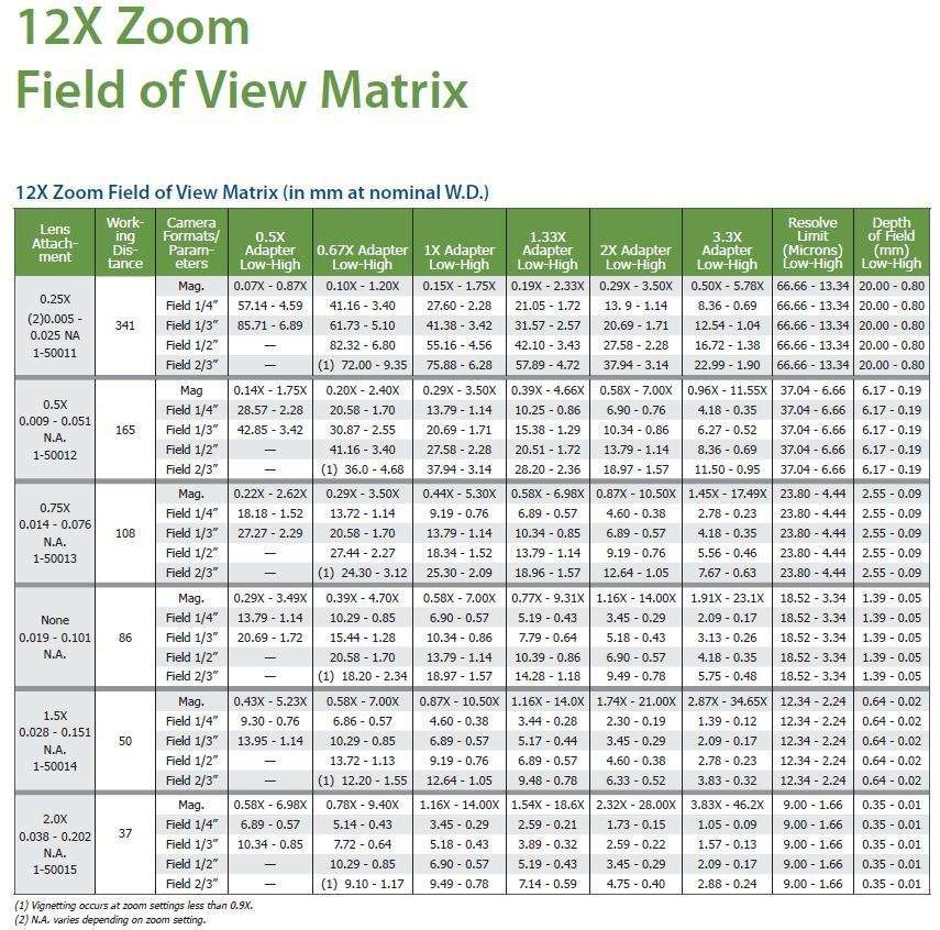 Navitar’sย 12X Zoom lenses offer the highest combination of zoom range and resolution in an optical system. Ideal for high magnification applications requiring the optimal balance between optical performance, large zoom range and price, the 12X offers incredible 12X (0.58-7X) magnification, increased resolution with 0.018-0.1 N.A., and unmatched edge flatness and clarity.