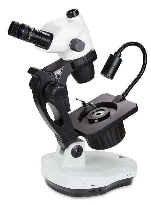 Stand for gemology with 0-45ยฐ tilting arm for dark- and brightfield contrast. Built in 100-240 V power supply