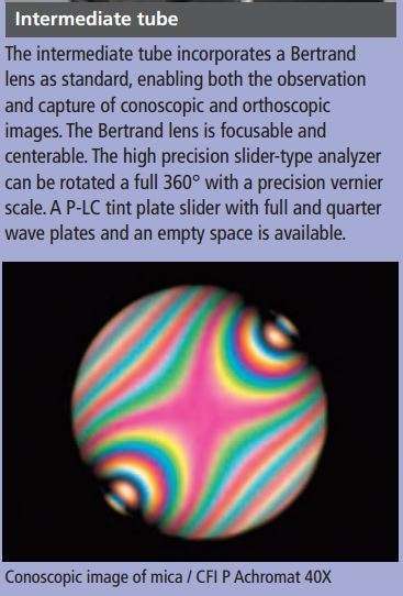 The intermediate tube incorporates a Bertrand lens as standard, enabling both observation and capture of conoscopic and orthoscopic images.