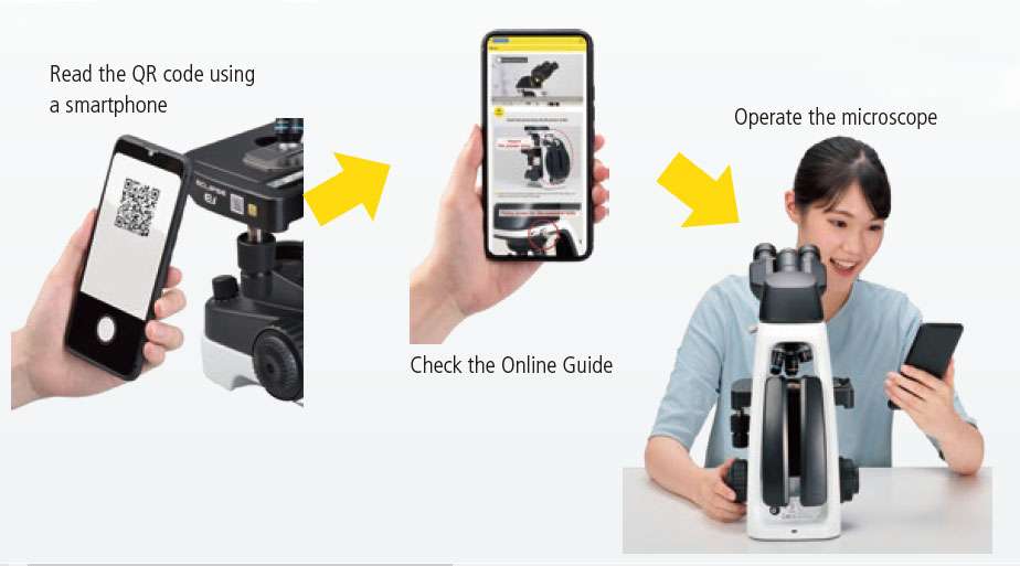 By simply scanning a QR code, students can quickly access the Online Guide on their smartphones to independently learn how to operate the microscope. The Online Guide can also be useful in preparing students before using the microscope and to reinforce concepts after using the microscope.