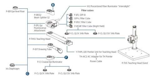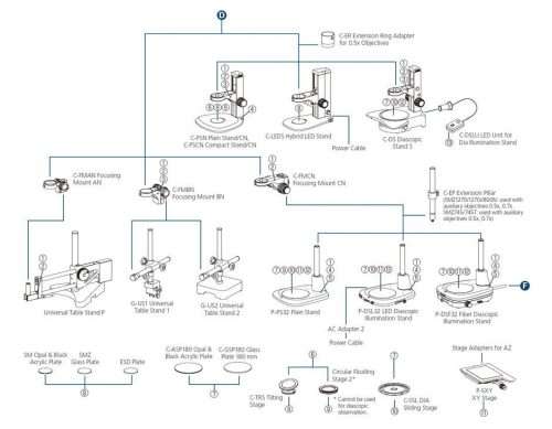 There are several eyepiece tubes to fit various configurations, from a simple setup to a system with some intermediate modules or digital cameras. With an ergonomic eyepiece tube, the observation angle can be adjusted from 0-30 degrees, allowing for comfortable observation postures even if combined with intermediate modules like illuminators or teaching heads.ย Furthermore, the Plain Stands and Diascopic LED Stands adapted a slim design for easier operation and exchange of specimens and samples.
